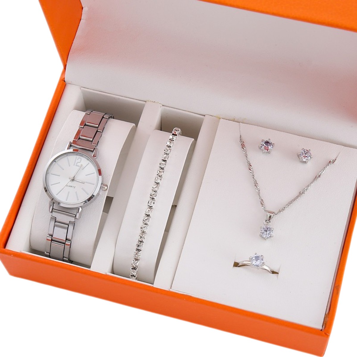 _ 1 collar con dije _ 1 par de pendientes a juego _ 1 anillo elegante Detalles: _ Acabado color dorado o plateado _ Diseño moderno y sofisticado _ Conjunto combinado a juego _ Presentación en estuche de regalo _ Ideal para uso diario o eventos especiales Un regalo completo, delicado y atractivo, pensado para destacar y sorprender con un detalle único y bien presentado.